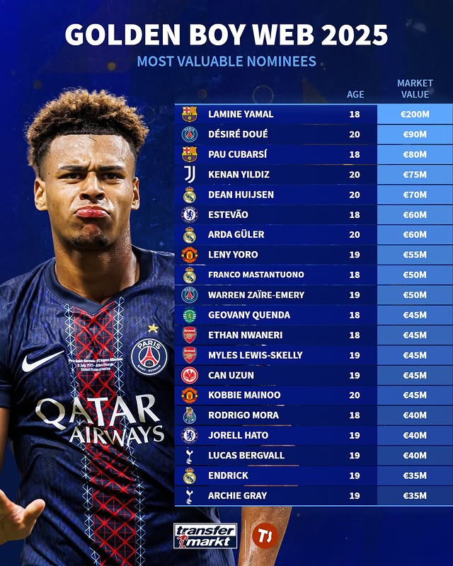 德转25年金童奖候选身价排名: 亚马尔、杜埃、库巴西前三